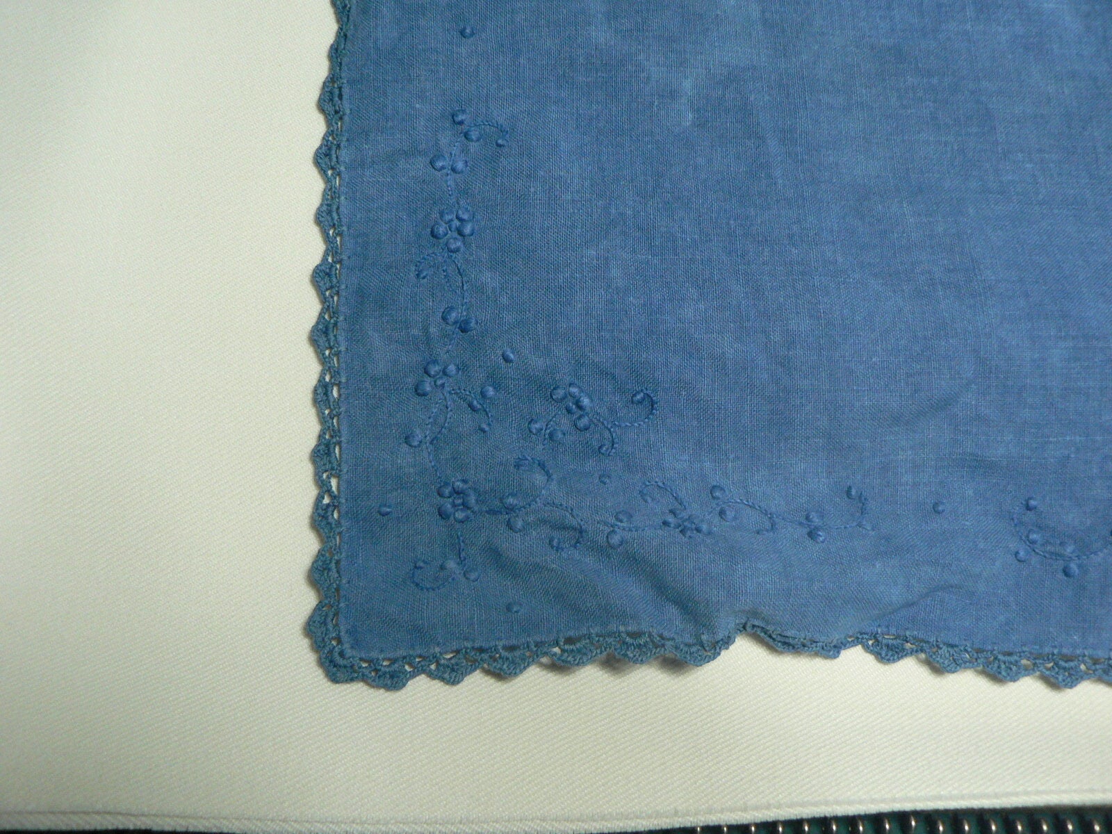 Petit mouchoir en lin bordé d'une fine dentelle et rebrodé de petites fleurs. Il est teint à l'indigo en bleu profond.