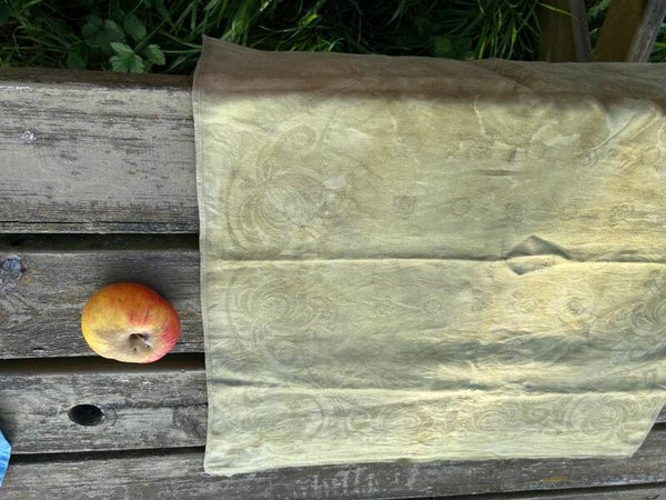 Très grande serviette en lin damassé teinte au pistachier térébinthe pour un kaki doré.