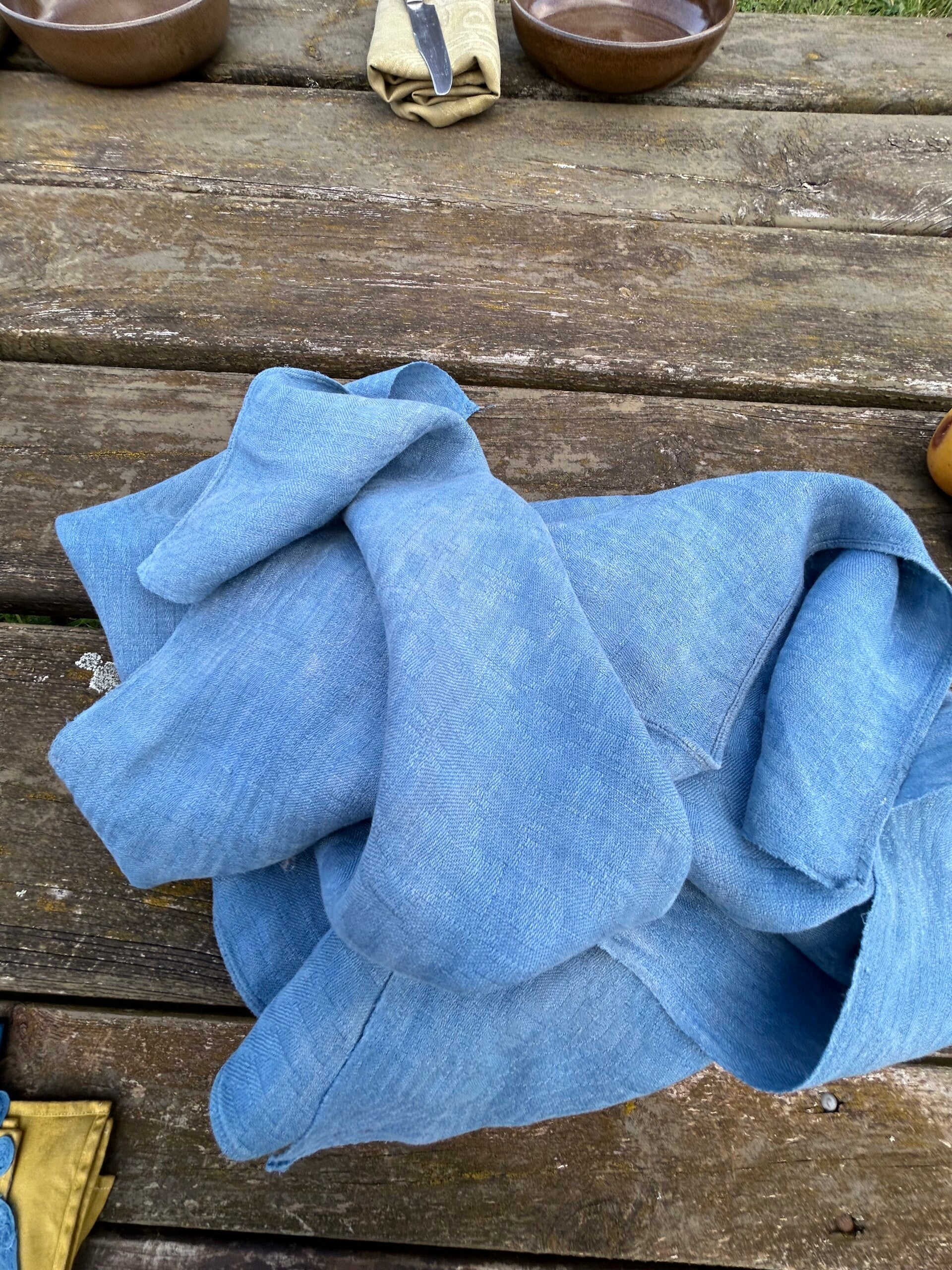 Grande serviette en lin damassé à motif géométrique teinte au cachou et à l'indigo pour un bleu gris glacier.